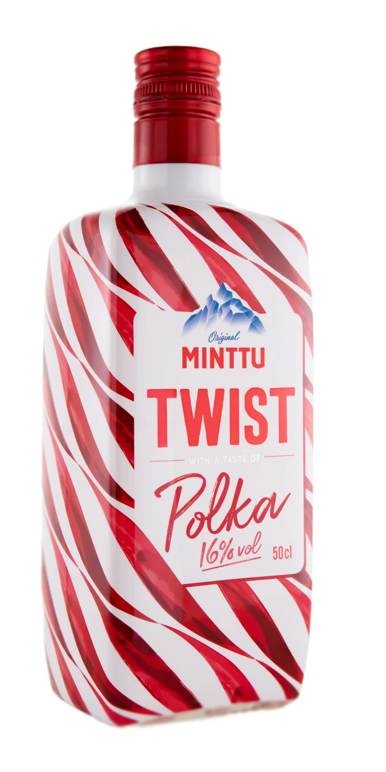 Mit der Twist Reihe bringt Minttu drei neue Likör-Sorten heraus, die sich an finnischen Süßigkeiten orientieren. Der Minttu Twist Polka Likör verbindet den klassischen Minttu Minz-Likör mit dem süßen Geschmack von roter Polka Süßigkeit. Frische Minznoten verbinden sich mit der Süße von Polka-Stangen und lässt so ein unverkennbares, aber neuartiges Minttu-Erlebnis entstehen.