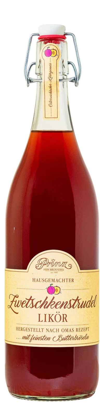 Der Prinz Zwetschkenstrudel Likör, präsentiert in der 1 Liter Bügel-Flasche, ist eine österreichische Spezialität, die nach Omas bewährtem Rezept hergestellt wird. Dieser Strudel-Likör wird aus dem selbstgepressten Saft vollreifer Zwetschken gewonnen und weckt mit seiner besonderen Würze und Süße wunderbare Kindheitserinnerungen.